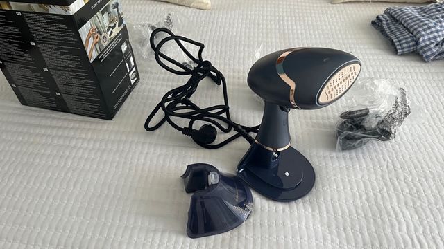 Plancha de vapor portátil de color azul marino con detalles en cobre. Incluye base y accesorios. - Diseño ergonómico. - Cable de alimentación. - Base de apoyo.