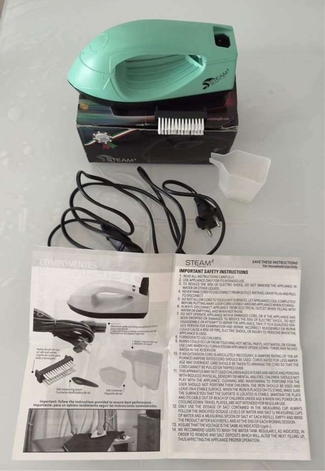 Detalles del productoPlancha de vapor portátil de la marca Steam. Incluye accesorios y manual de instrucciones.