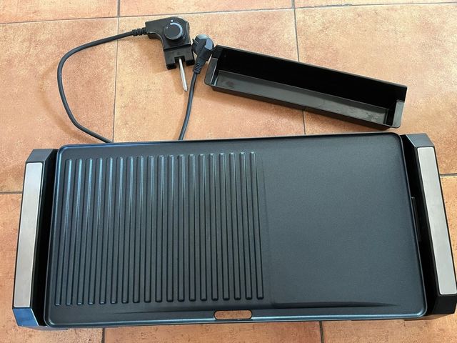 Plancha eléctrica de asar nueva (se ha usado 1 vez) . Incluye bandeja recogegrasas. - Superficie de cocción con estrías. - Control de temperatura. - Fácil de limpiar.