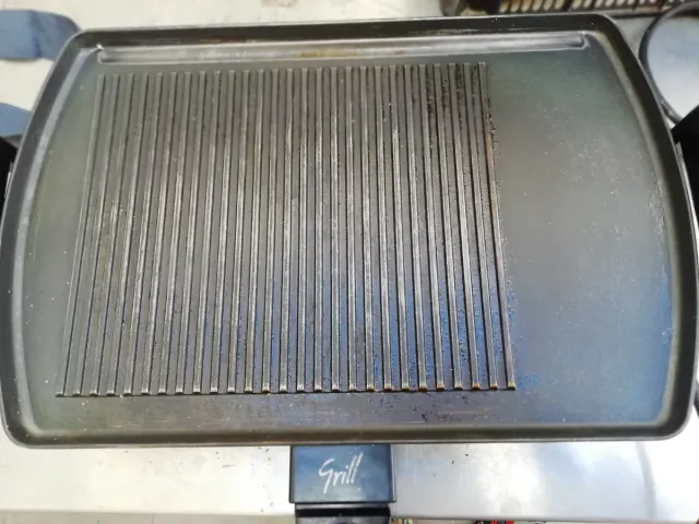 Plancha grill eléctrica con superficie acanalada para cocinar tus alimentos favoritos. - Superficie de cocción acanalada. - Diseño compacto y fácil de usar.