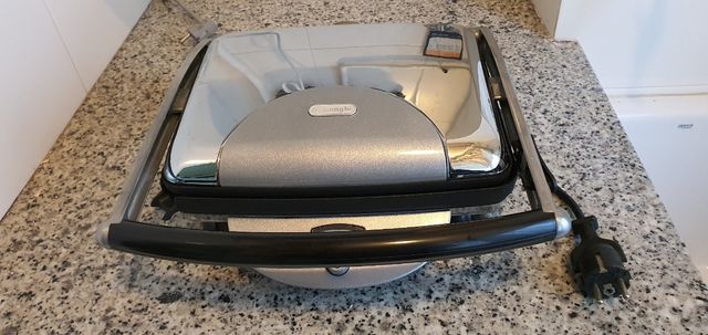 ventana de temperatura, bloqueo de las asas, tiene señales en el plateado exterior de haber frotado al limpiar y se han quedado las rayas, (2 ultimas fotos) solo eso, las planchas están impolutas, 1.800w, útil y bonita plancha multiusos, 35 euros