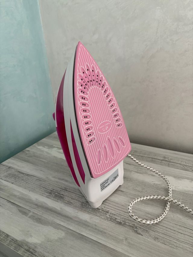 Plancha de vapor en color rosa y blanco, en buen estado. - Suela de cerámica. - Temperatura regulable. - Cable de alimentación de longitud considerable.