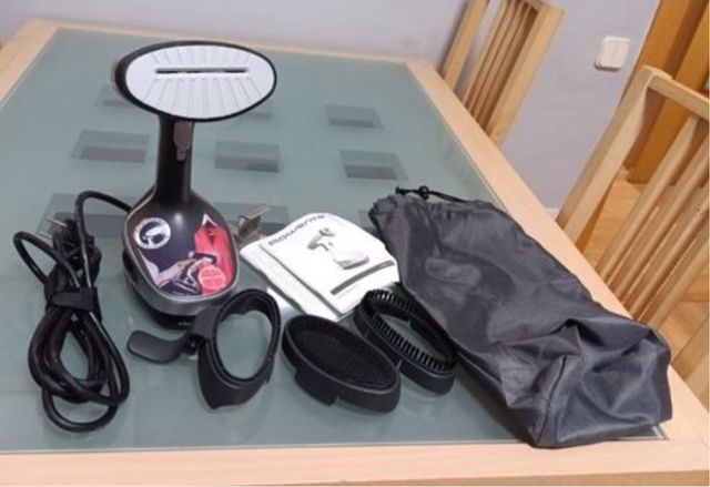 Plancha de vapor vertical Rowenta. - Mango ergonómico. - Base de planchado. - Cepillo para tejidos. - Bolsa de almacenamiento.