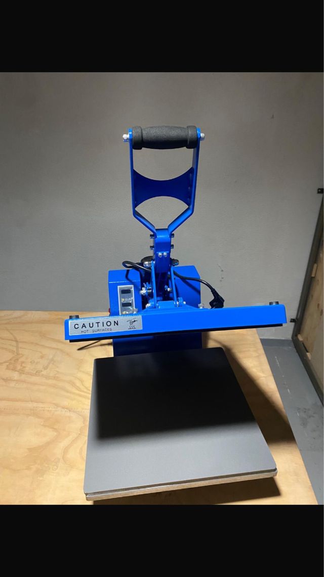 Detalles del productoPlancha térmica de color azul, ideal para sublimación en textiles. Cuenta con un asa ergonómica para facilitar su uso.