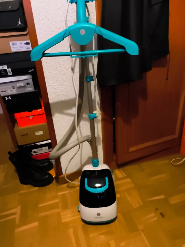 Detalles del productoPlancha vertical de vapor Klindo con un diseño moderno en blanco y azul.