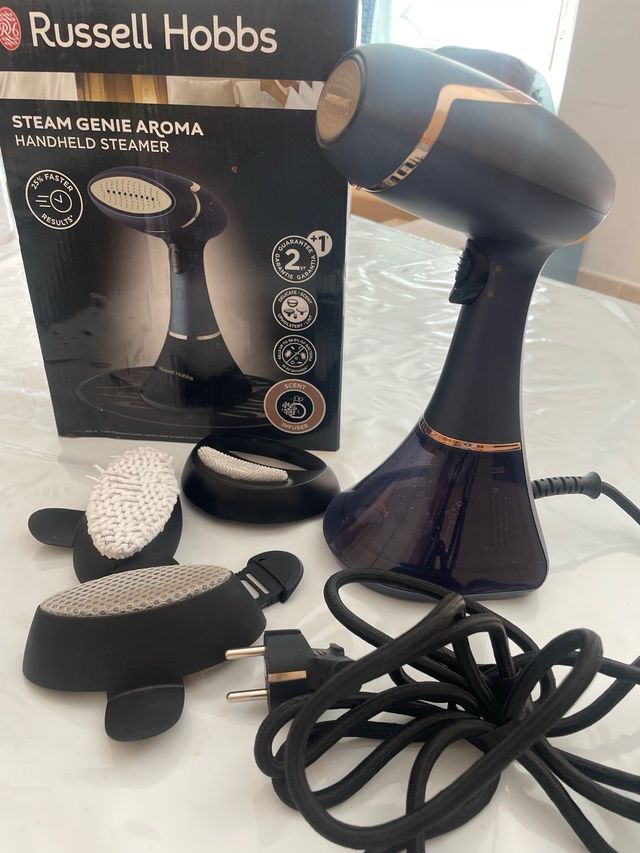 Detalles del productoPlancha vertical de mano Russell Hobbs Steam Genie Aroma, en perfecto estado. Incluye varios cabezales. Es de color azul oscuro con detalles dorados. ¡Ideal para planchar ropa fácilmente!