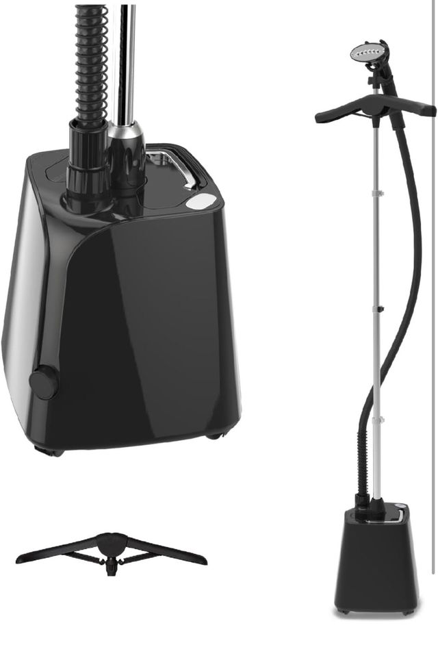 Detalles del productoPlancha vertical de vapor marca STEAMONE en color negro. Incluye un soporte para colgar la ropa y una manguera flexible.