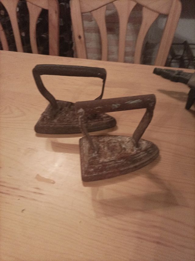 Dos planchas de hierro antiguas, perfectas para coleccionistas o decoración. - Fabricadas en hierro fundido. - Diseño clásico con asa. - Ideales para exhibición.