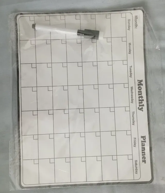 Planificador mensual tipo pizarra blanca, ideal para organizar tus tareas y citas. - Incluye rotulador. - Diseño de calendario mensual.