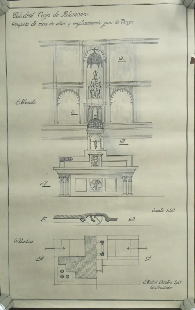 Detalles del productoPlano arquitectónico original de gran formato, dibujado a tinta y lápiz sobre papel vegetal, correspondiente al proyecto de nueva mesa de altar y emplazamiento para la imagen de la Virgen en la Catedral Vieja de Salamanca (Catedral de Santa María).