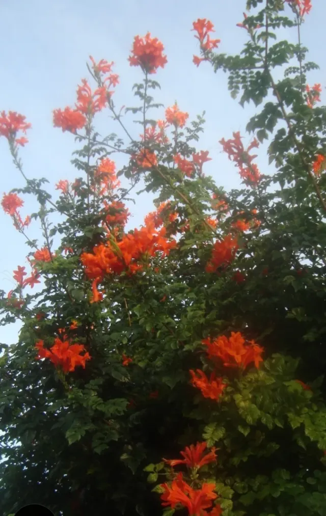 Planta de Bignonia trepadora con flores naranjas. Se venden 2 hijos separados en la misma maceta. - Ideal para jardines y balcones. - Crecimiento vigoroso.