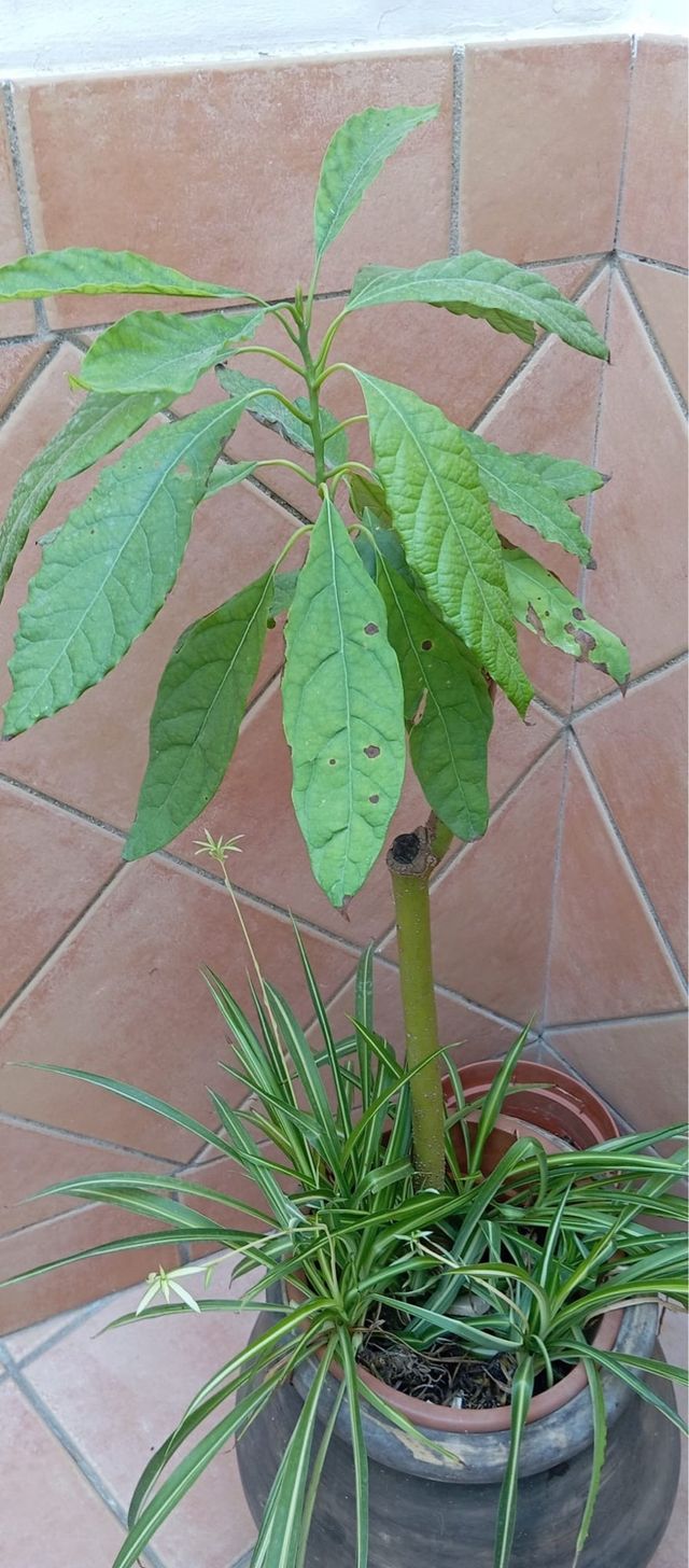 Planta de aguacate joven. - Hojas verdes. - Tronco verde.