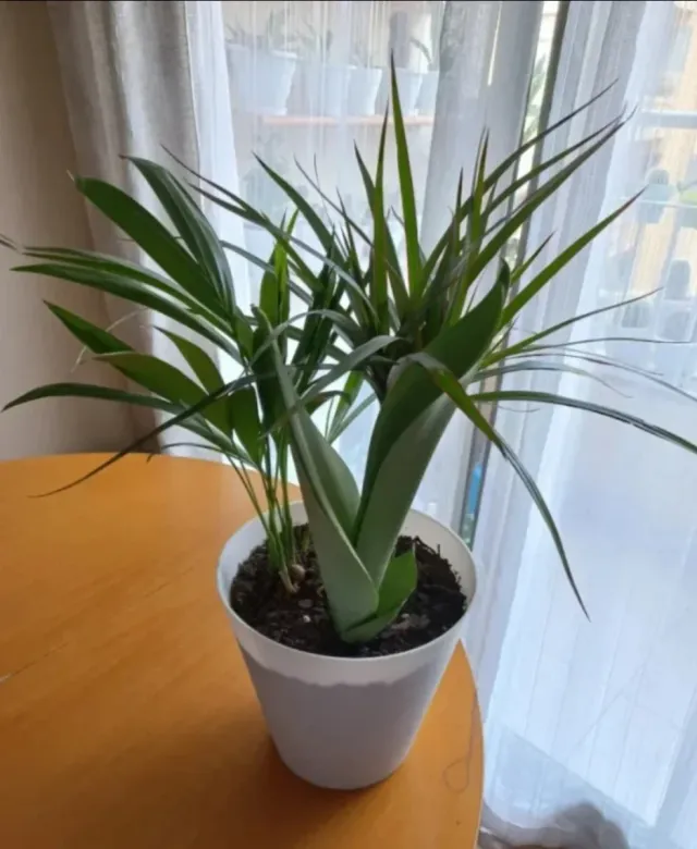 Planta de interior en maceta blanca. - Hojas verdes y alargadas. - Ideal para decorar espacios interiores.