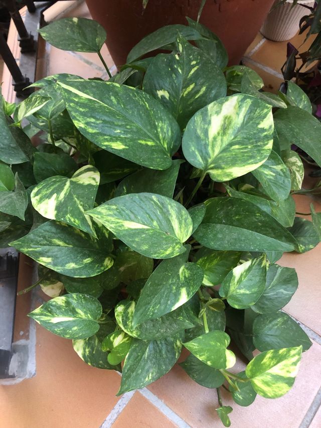 Planta de interior Potos con hojas verdes y amarillas. Es una planta muy resistente y fácil de cuidar. - Hojas variegadas. - Ideal para colgar o trepar.