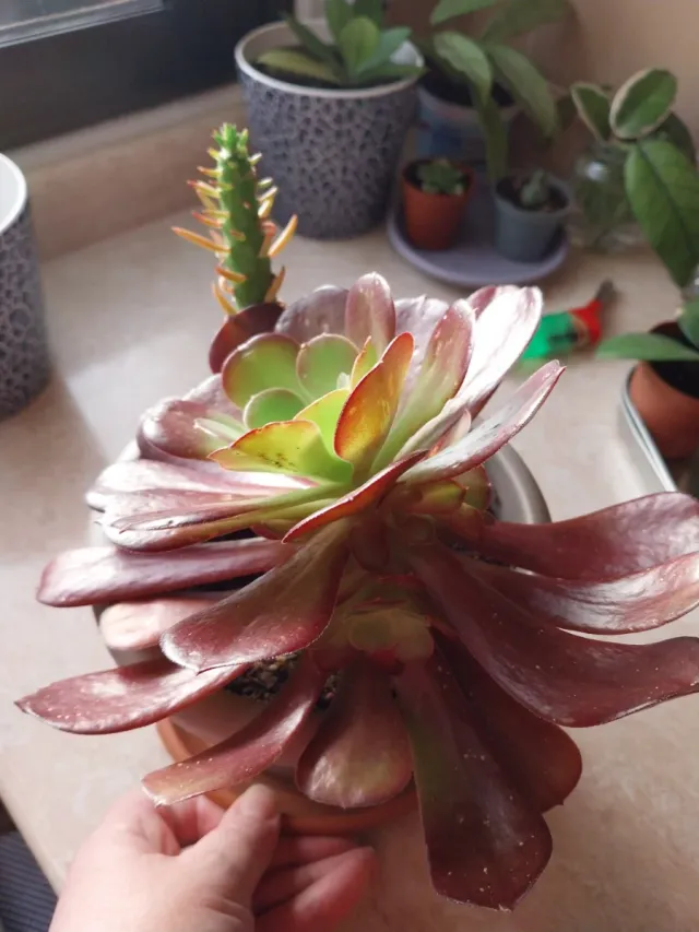 Planta suculenta de interior con hojas carnosas y un tallo central. - Hojas de color verde y rojizo. - Ideal para coleccionistas de suculentas.