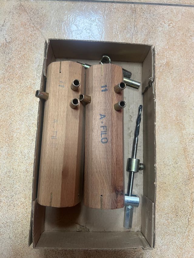 Detalles del productoSet de plantillas para montaje de pernios OTLAV A FILO. Incluye dos piezas de madera con guías metálicas y broca.