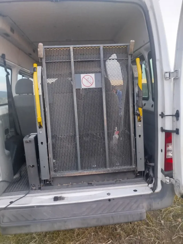 Plataforma elevadora para sillas de ruedas, diseñada para ser instalada en furgonetas. - Estructura metálica. - Señal de prohibido fumar visible.