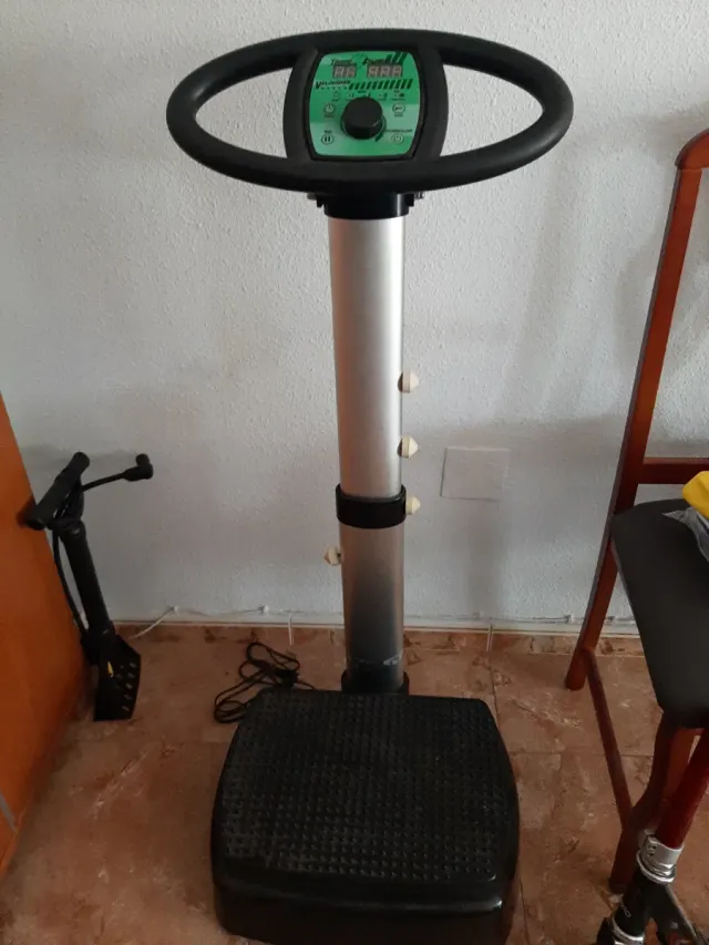 Detalles del productoPlataforma vibratoria para ejercicio en casa. Cuenta con un manillar para mayor estabilidad y una pantalla digital.