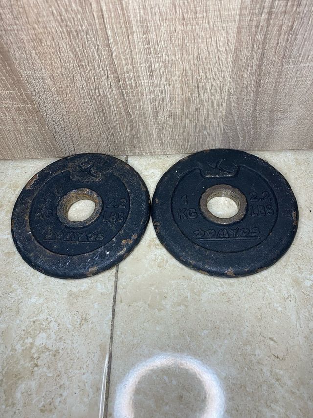 Detalles del productoDos platillos de pesas, uno de 1 kg y otro de 2.2 lbs (aproximadamente 1 kg).