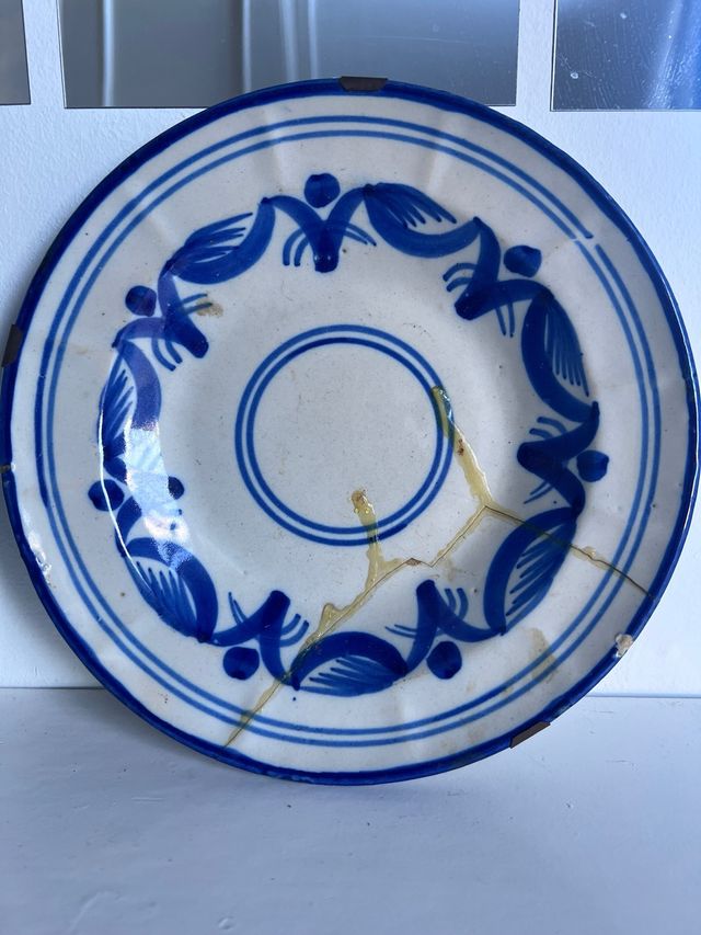 Plato antiguo decorado azul y blanco