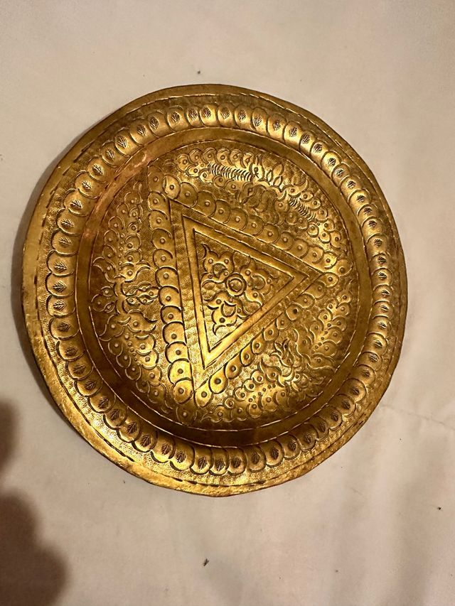 Detalles del productoElegante plato antiguo árabe. Es de color dorado no es laton (el iman no pega) posiblemente bronce por su peso...y tiene un diámetro de 18 cm.