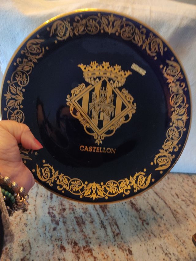 Detalles del productoPlato conmemorativo con el escudo de la ciudad de Castellón en azul cobalto y trabajado en oro de ley, fabricado por Ulises, en España. Una preciosidad al natural. Un bonito recuerdo o regalo. Tiene unos 20 años. 24 cm de diámetro.