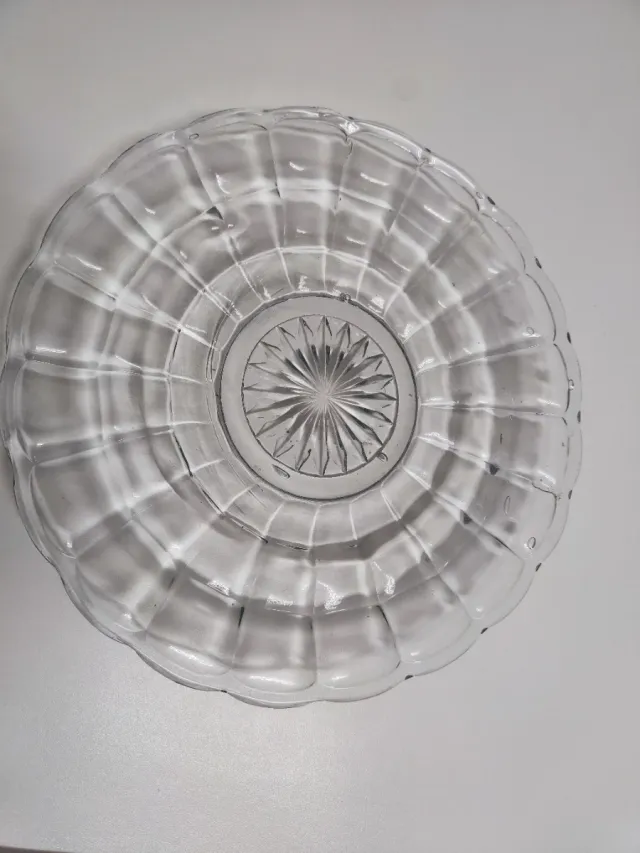 Detalles del productoElegante plato de cristal con un diseño grabado en el centro y un borde festoneado.