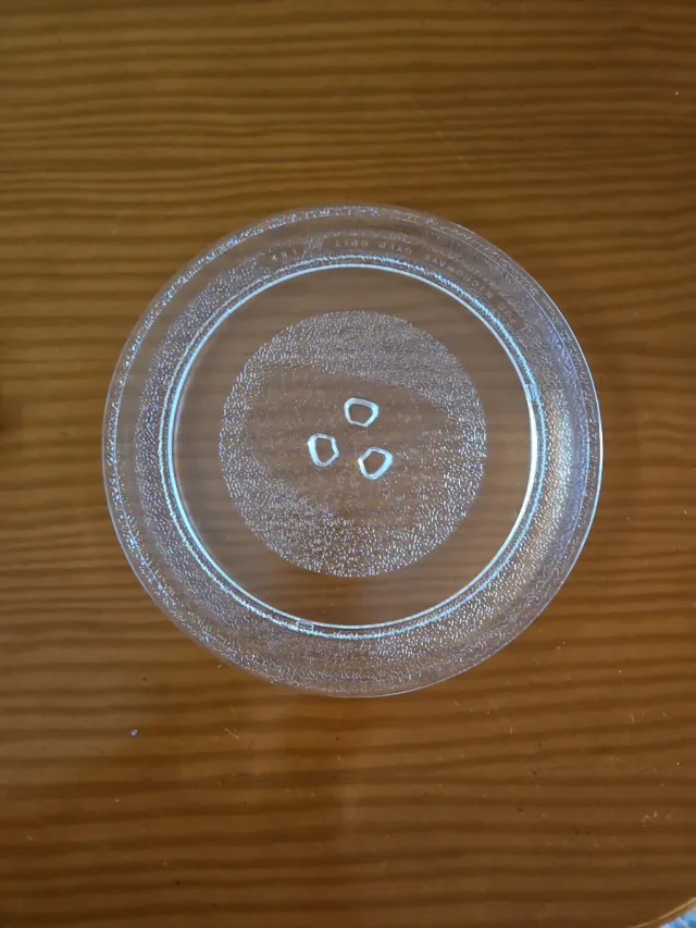 Detalles del productoPlato giratorio de cristal para microondas. Tiene un diseño texturizado y un borde reforzado.