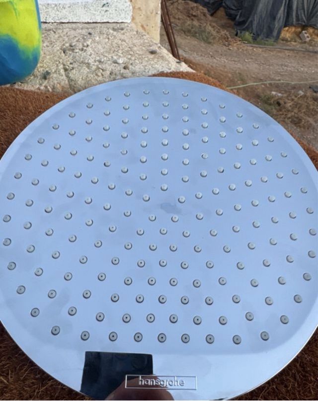 Plato de ducha redondo de la marca Hansgrohe. Diseño moderno y funcional. - Material: Metal cromado. - Múltiples orificios para una distribución uniforme del agua.