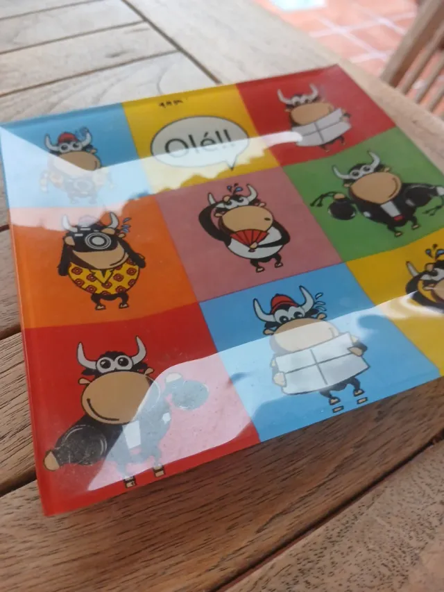 Detalles del productoPlato decorativo de cristal con un diseño divertido de toros.