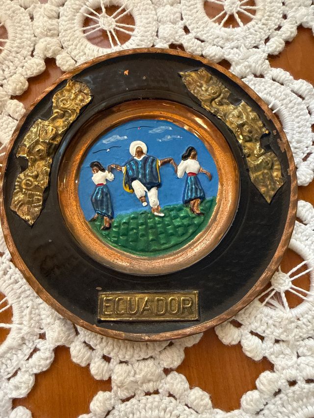 Detalles del productoPlato decorativo con escena de Ecuador. Presenta un diseño con figuras y paisaje.