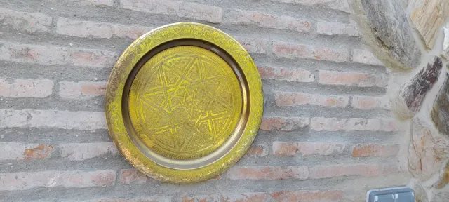 Detalles del productoPrecioso plato decorativo de latón con un diseño árabe intrincado. Ideal para añadir un toque de elegancia a cualquier espacio.