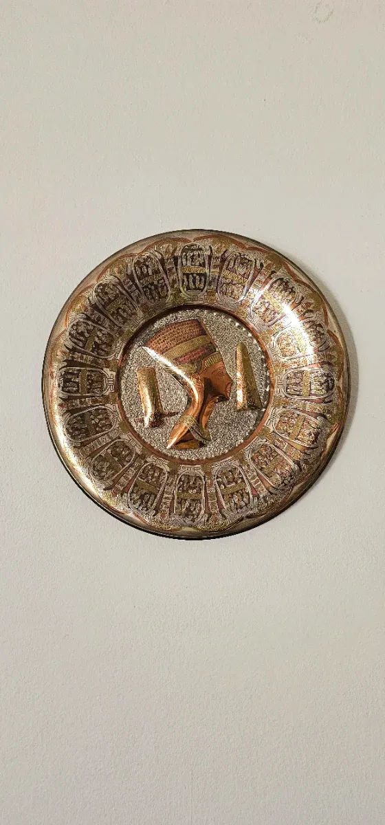 Plato decorativo con motivos egipcios, fabricado en metal.
