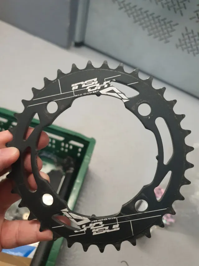 Plato para bicicleta BMX race. Diseño en color negro con detalles blancos. - 36 dientes. - Material: Aluminio. - Compatibilidad: Eje 104 BCD.