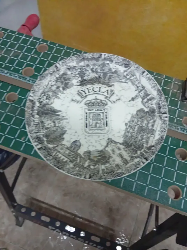 Detalles del productoPlato decorativo conmemorativo de Yecla. Presenta un diseño detallado con edificios emblemáticos y el escudo de la ciudad.