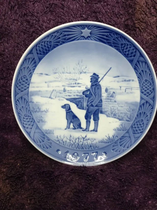 Detalles del productoPlato decorativo de Royal Copenhagen del año 1977. Presenta un diseño de caza con un hombre y su perro en un paisaje invernal.