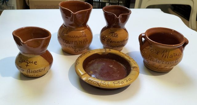 Detalles del productoprecioso y antiguo plato y jarras pequeñas de barro cocido con el nombre de los restaurantes míticos de Segovia.