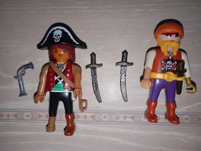 Set de dos figuras de piratas de Playmobil, listas para la aventura. - Incluye dos espadas. - Un trabuco. - Un cinturón con funda para espada.