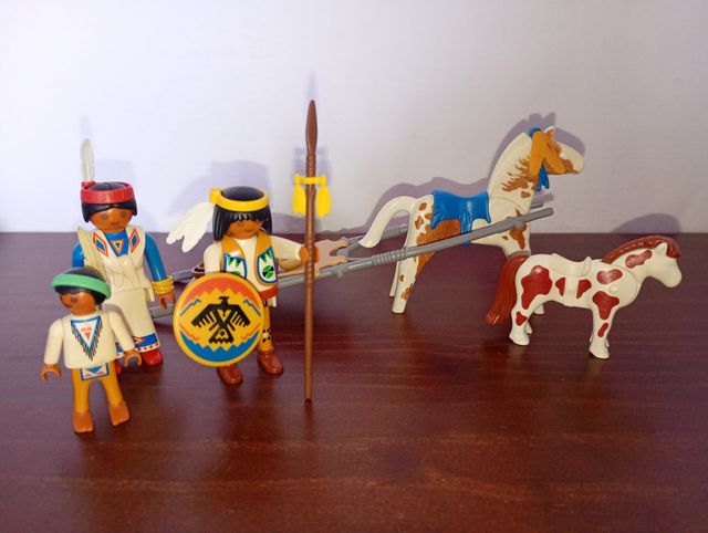 Set de Playmobil 3872 de indios americanos con caballos y accesorios. - Incluye figuras de indios. - Dos caballos y cama. - Lanza y escudo.