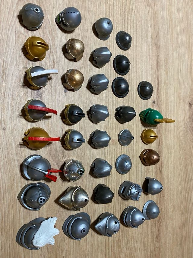 Detalles del productoplaymobil 41 cascos mediebales, banderas, escudos, todo lo que se ve en las fotos. hago envios. susane, fuerte, piratas, baqueros, indios, soldados, sudistas.nordistas,romanos,piramide, barco.
