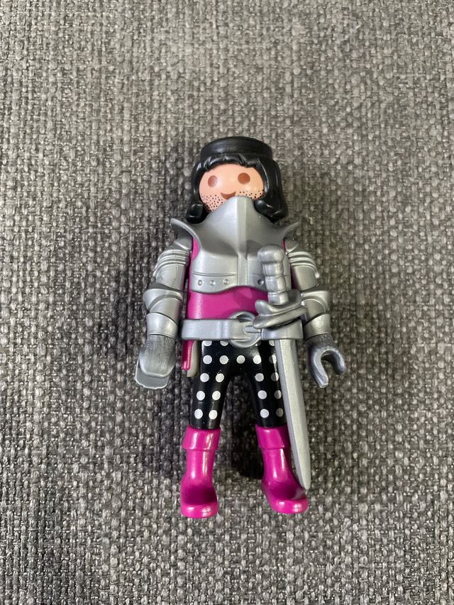 Figura de Playmobil del Rey Bárbaro. - Incluye armadura plateada y detalles en rosa. - Pantalones negros con lunares blancos. - Botas rosas. - Espada plateada.