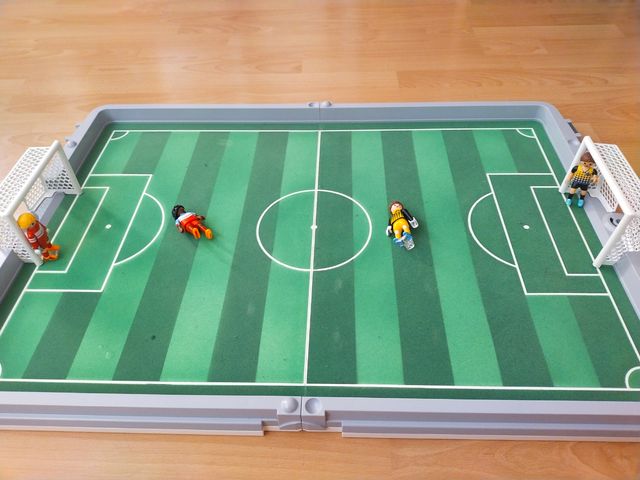 El campo está en muy buen estado pero falta el balón y las bases para los jugadores. Mi hijo jugaba con otros muñecos de Playmobil ya que el juego solo llevaba 4.