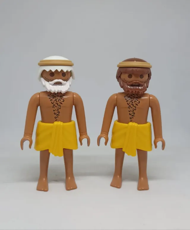 Dos figuras de Playmobil de hombres antiguos con túnicas amarillas. - Figuras de plástico. - Túnicas de tela amarilla. - Accesorios para la cabeza.