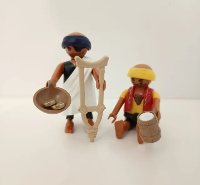 Detalles del productoFiguras de Playmobil que representan a dos mendigos. Uno de ellos está apoyado en una muleta y sostiene un cuenco con monedas, mientras que el otro está sentado y sostiene una jarra.