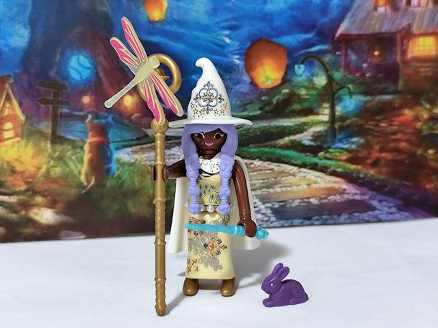 Detalles del productoFigura de Playmobil Bruja del Bosque con báculo con libélula, capa y conejo