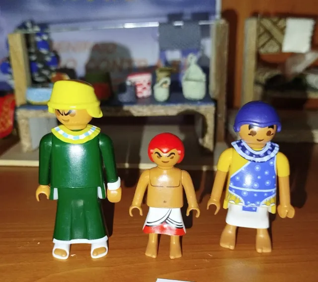 Figuras de Playmobil de temática egipcia. - Figura con túnica verde y casco amarillo. - Figura infantil con taparrabos. - Figura con túnica amarilla y azul.