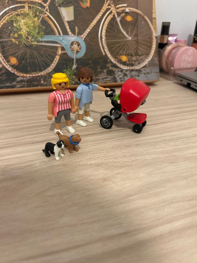 Detalles del productoConjunto de figuras Playmobil que incluye una familia con bebés y perros.
