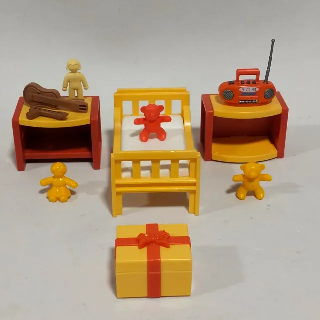 Detalles del productoPlaymobil Habitación infantil con cama, dos mesitas de noche, caja de regalo, radio, dos ositos de peluche, dos muñequitas, pequeña guitarra y flauta,