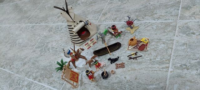 Detalles del productoVendo figuras y accesorios Playmobil de indios. El set incluye una tipi, canoa, figuras de personas y animales, y otros accesorios. campamento indio del oeste 3733
