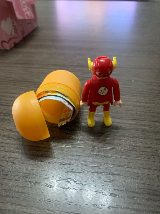 Detalles del productoFigura de Playmobil del personaje Flash, proveniente de un huevo Kinder Sorpresa. La figura es de color rojo y amarillo.